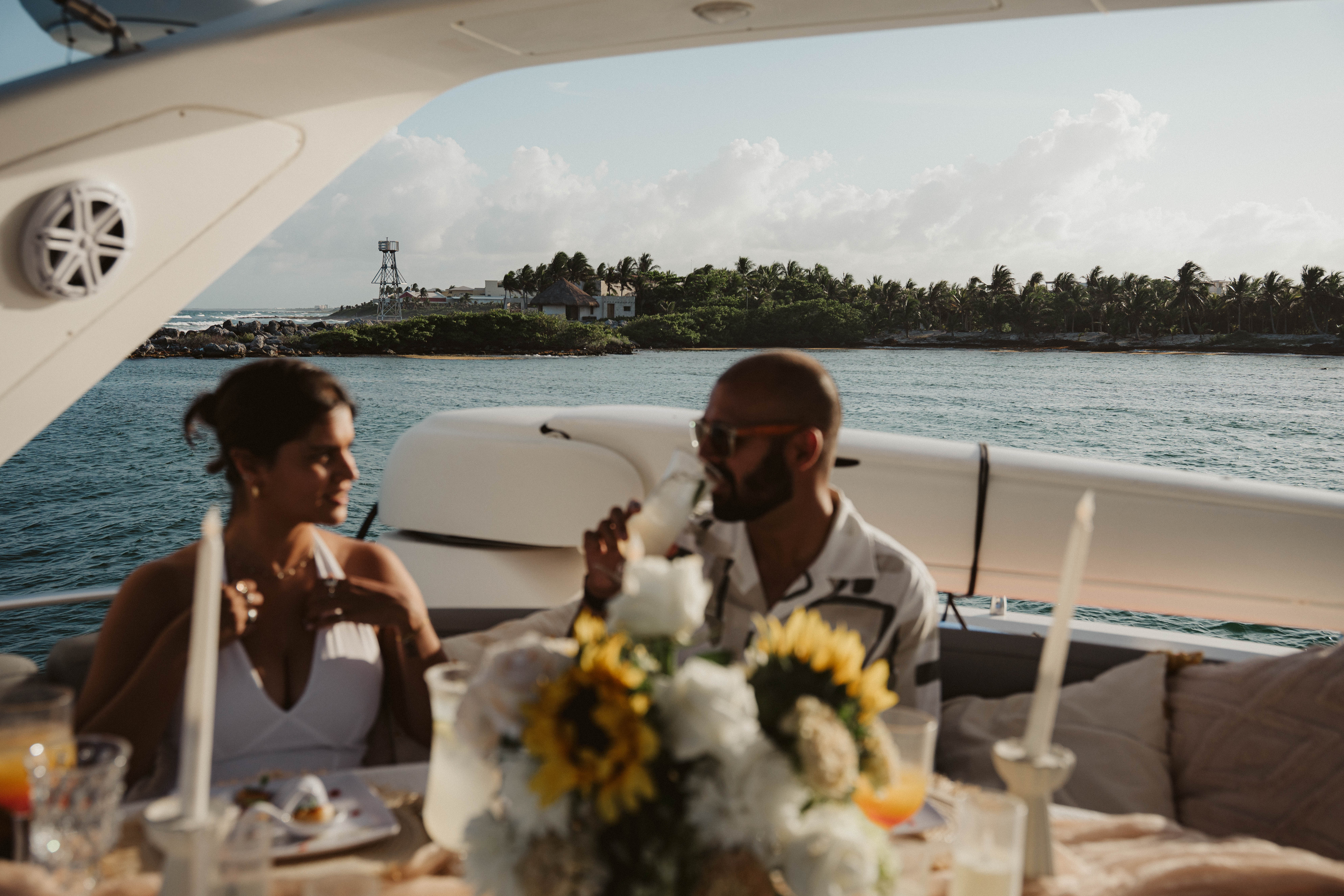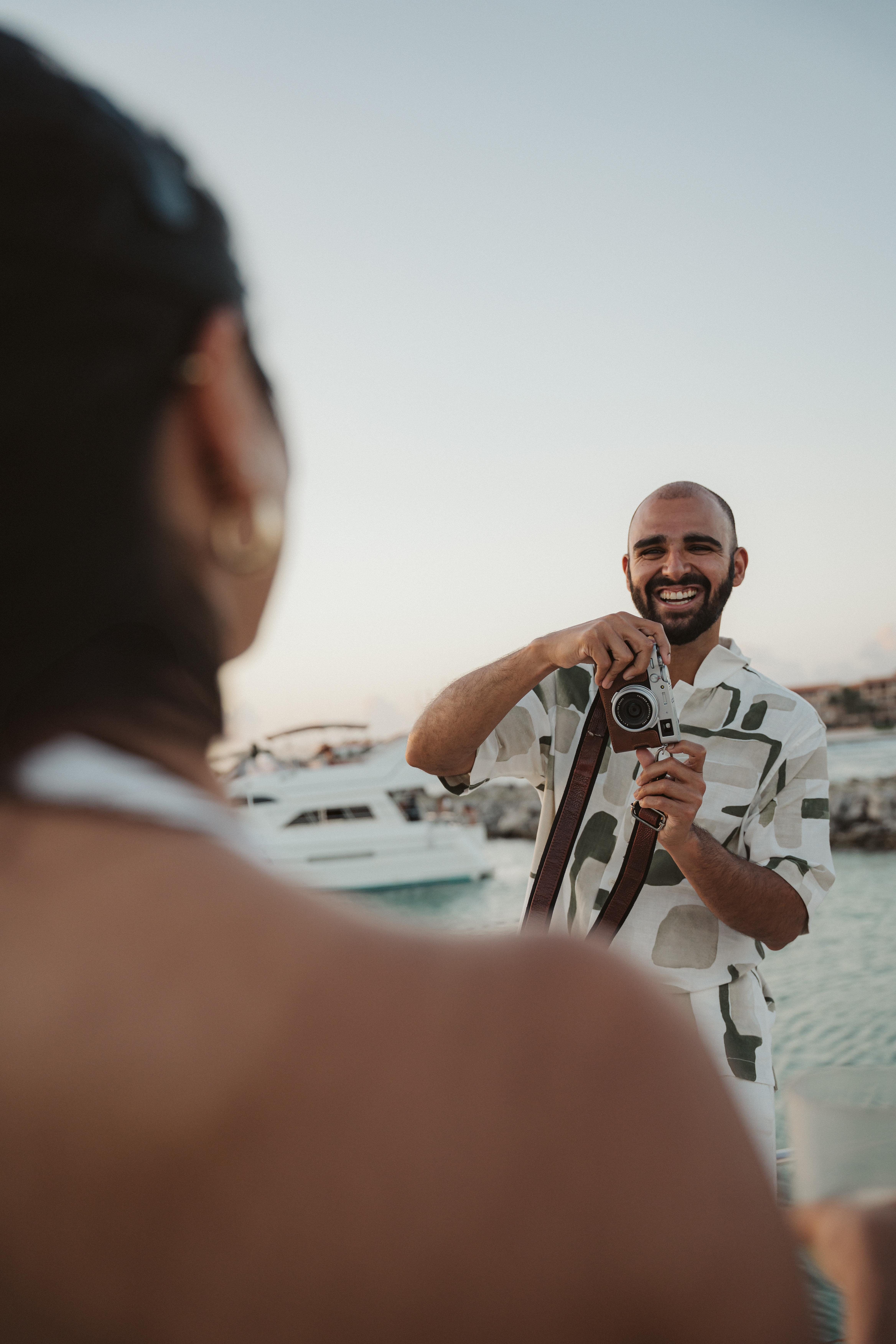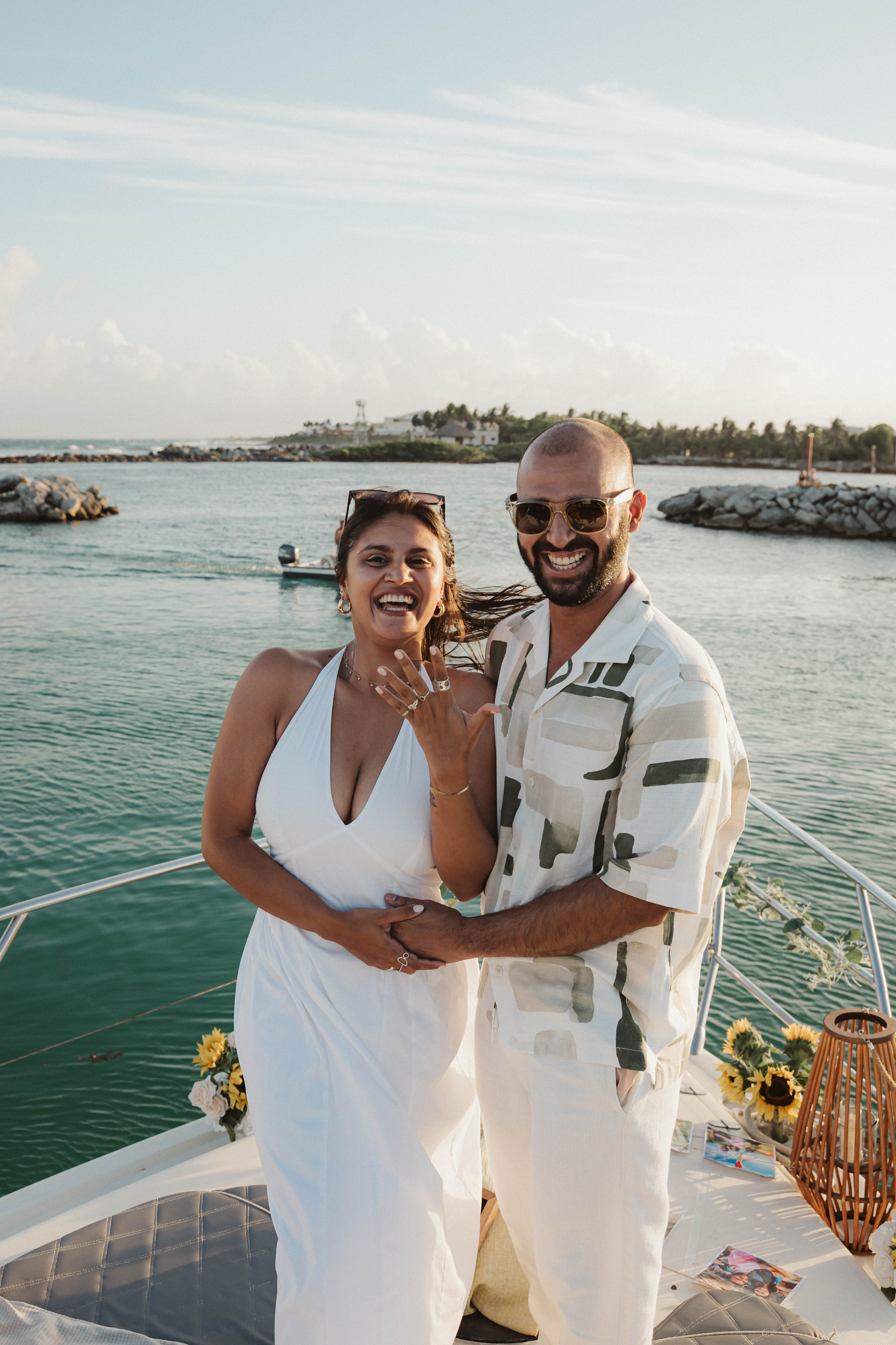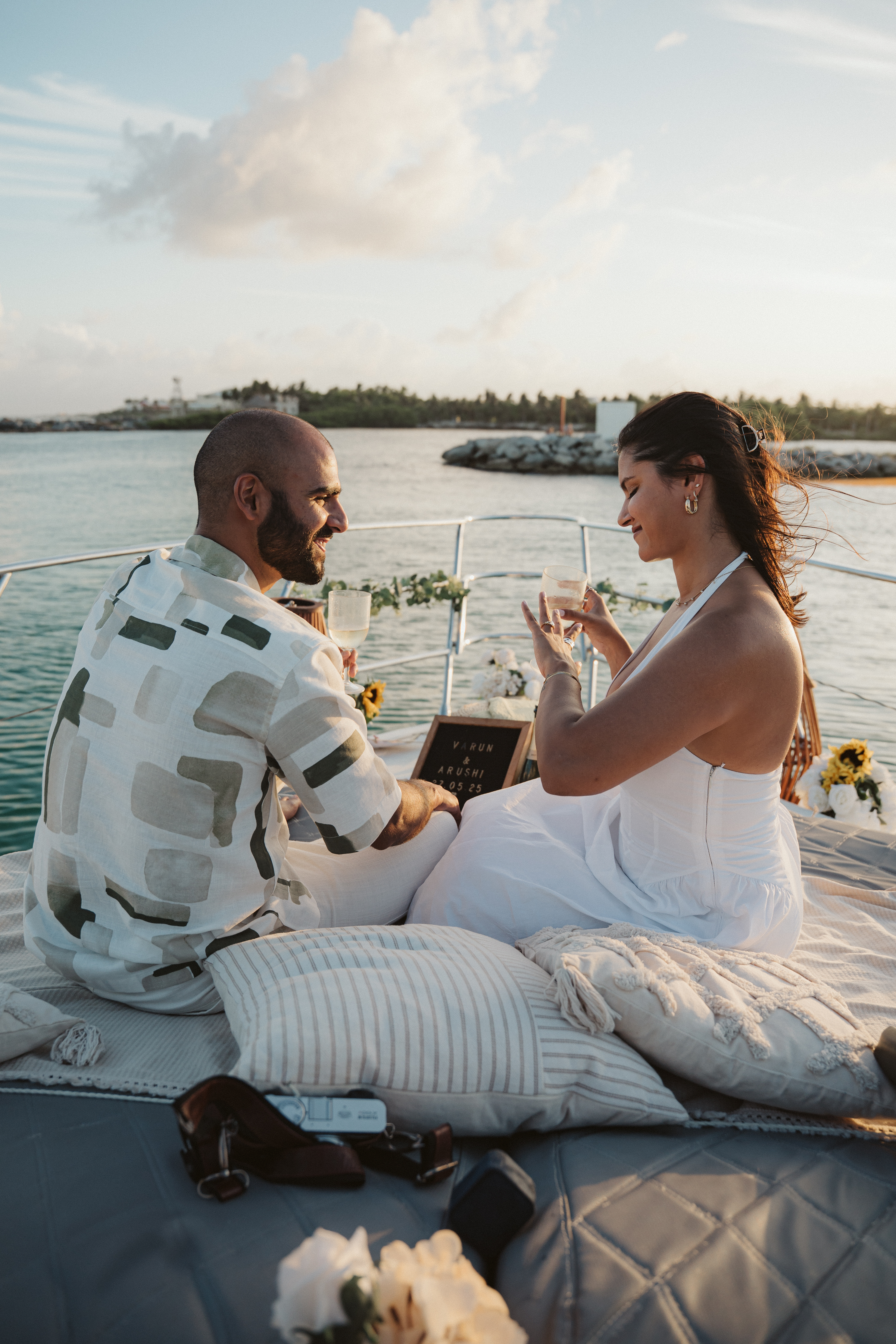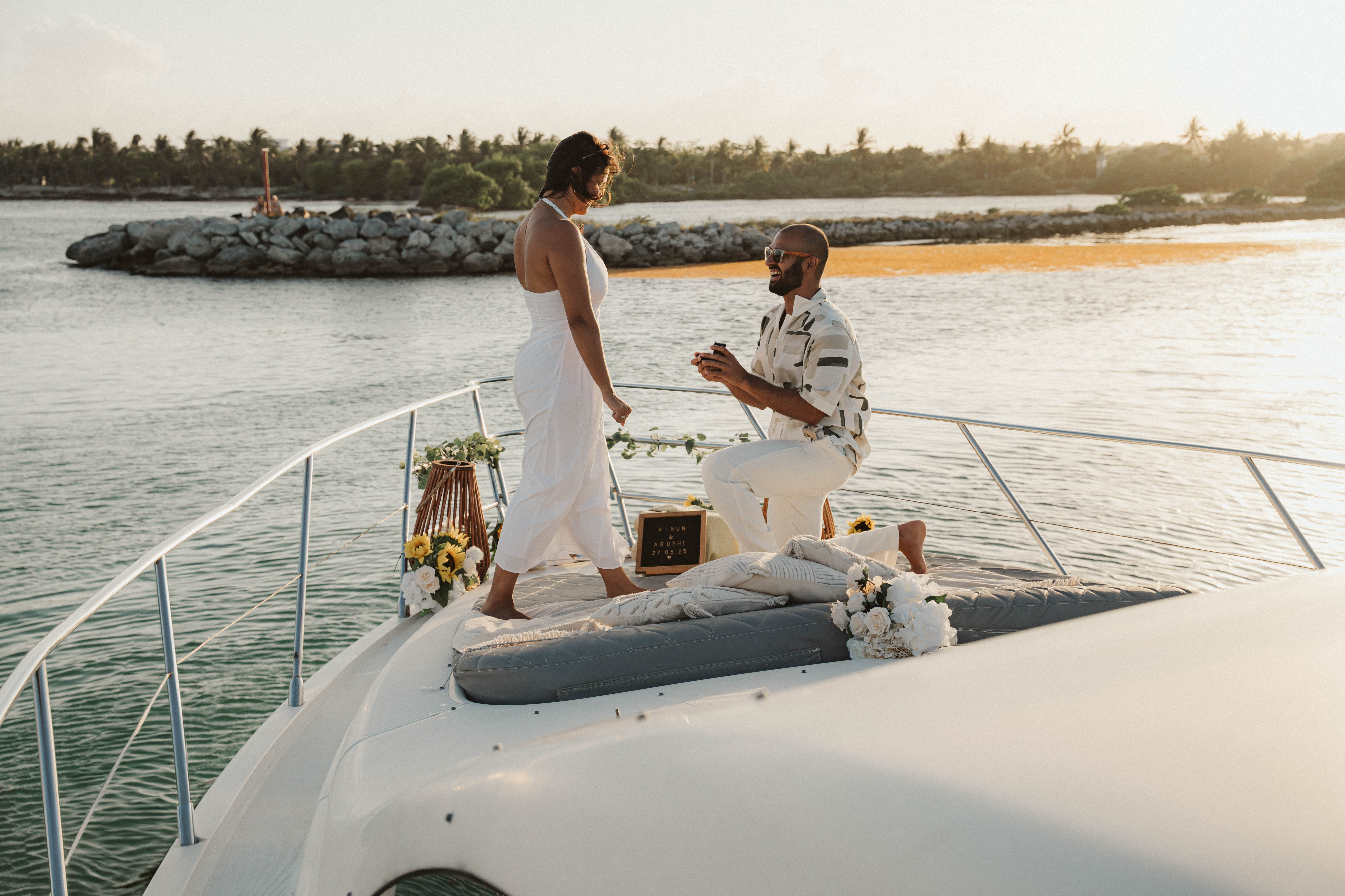 Arushi and Varun experienced a sunset to remember during a romantic yacht ride along the coast. Surrounded by warm light and the sea breeze, they laughed, took candid photos with their own camera, and cherished special memories together. As the sun dipped below the horizon, Varun led Arushi to the front of the yacht for a heartfelt proposal, followed by a joyful toast and the beginning of their forever.